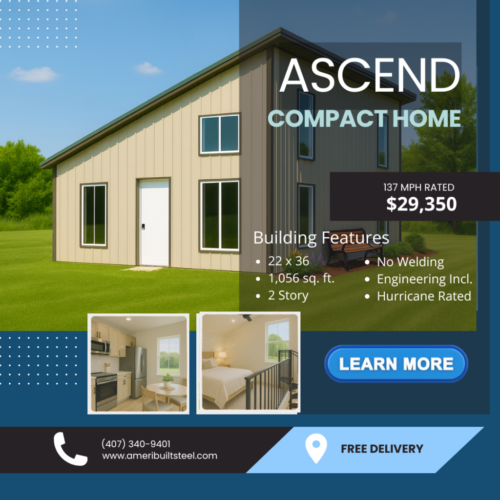 The Ascend is a compact two story steel home that delivers modern design in an efficient footprint. With just over 1,000 square feet of living space, it’s ideal for small families, guest houses, or minimalist living with lasting durability.